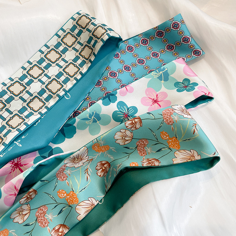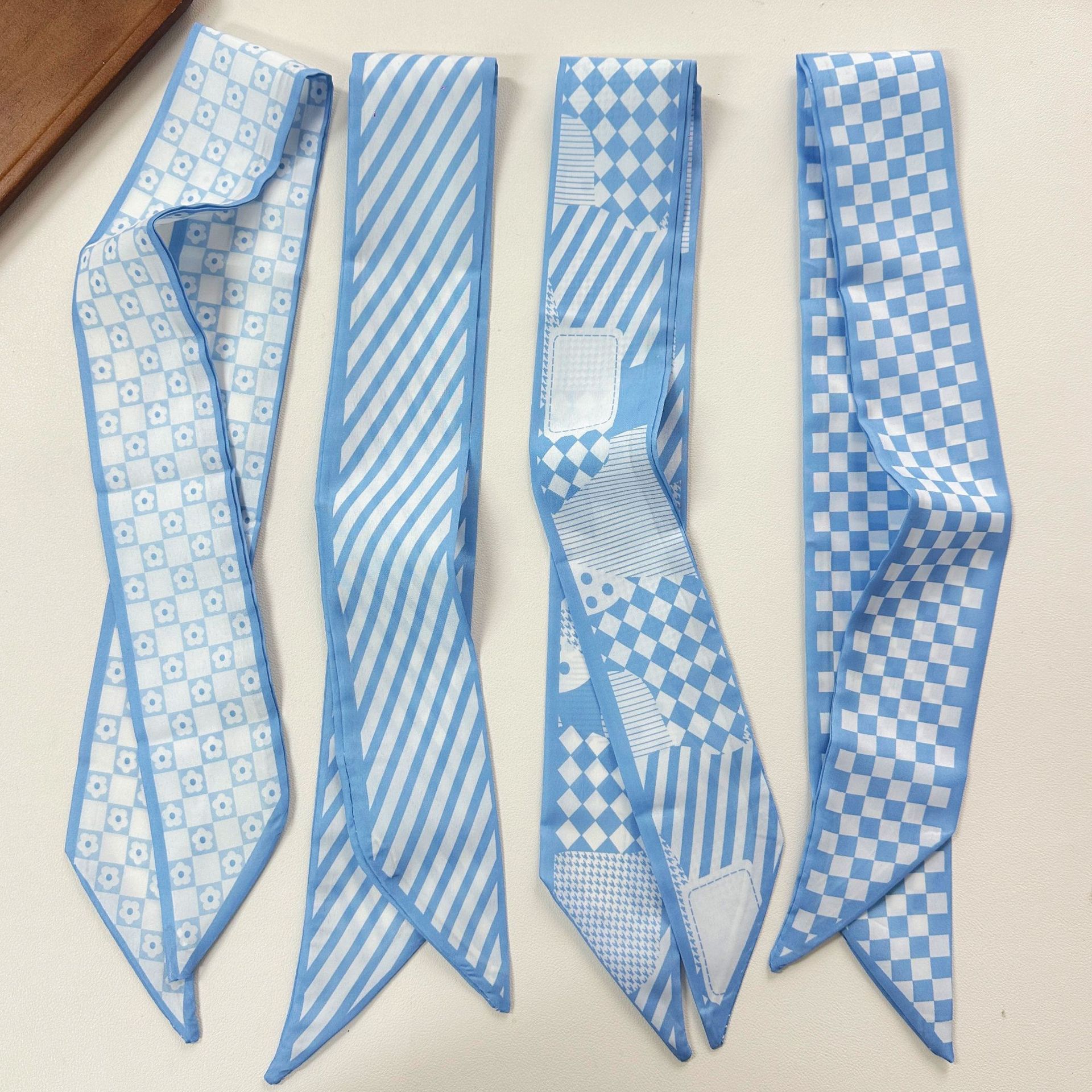 韓国風ブルーシルクスカーフヘッドバンド女性のための小さな長い薄いサテン帽子ニッチリボン市松模様の花のヘアアクセサリー