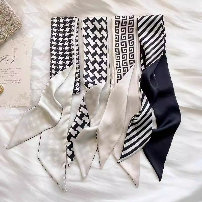 韓国系はシンプルで白黒のストライプの格子の二重のプリントの小さいスカーフに合わせて長いスカーフの女性のリボンを縛ります。
