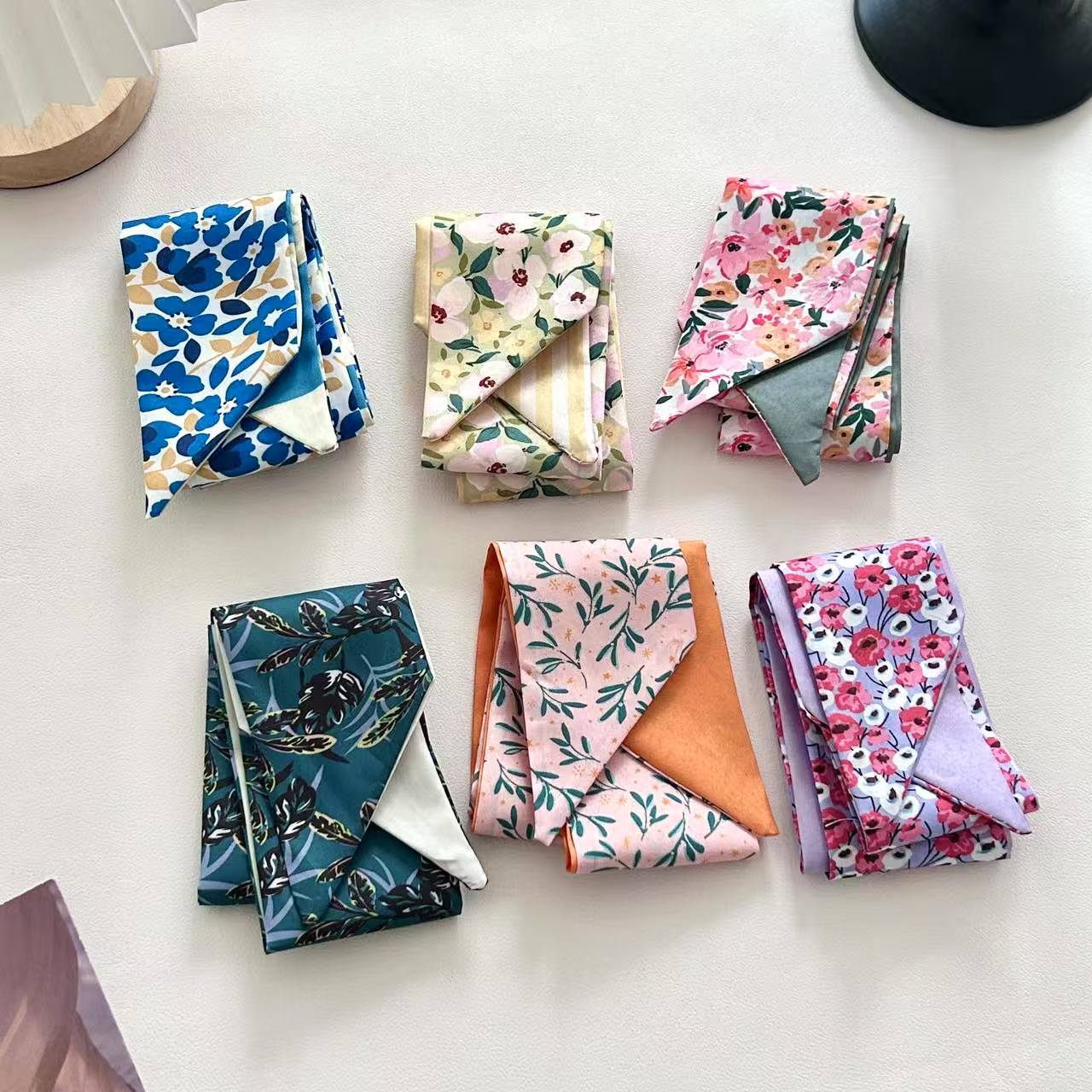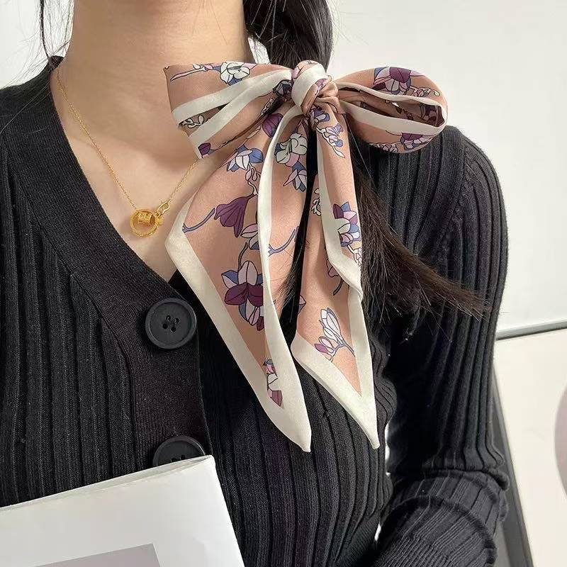 新しい花柄シルクスカーフ、春の薄い韓国風シャツスカーフ、リボン装飾、多用途のヘアタイ、バッグリボン