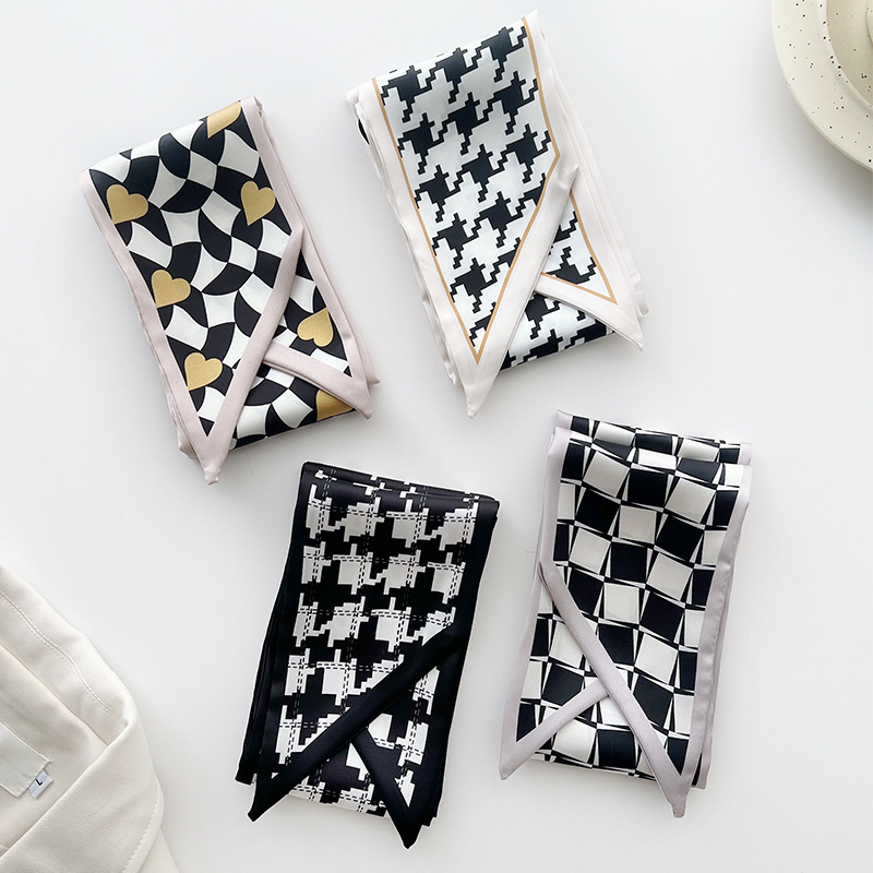 韓国のシンプルな黒系の格子の二重のプリントの小さいスカーフの百合のファッションの尖った角の長い条は縛ります。