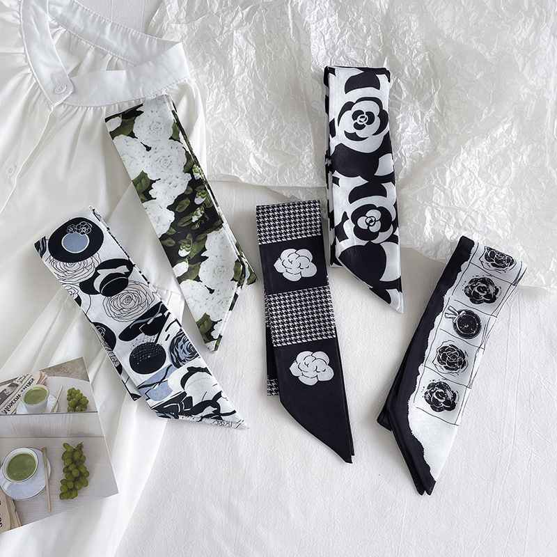 フランス式の清冷系の小さいスカーフのツバキの花のプリントのシルクの布の気質の長い条は髪を結んで包みます。