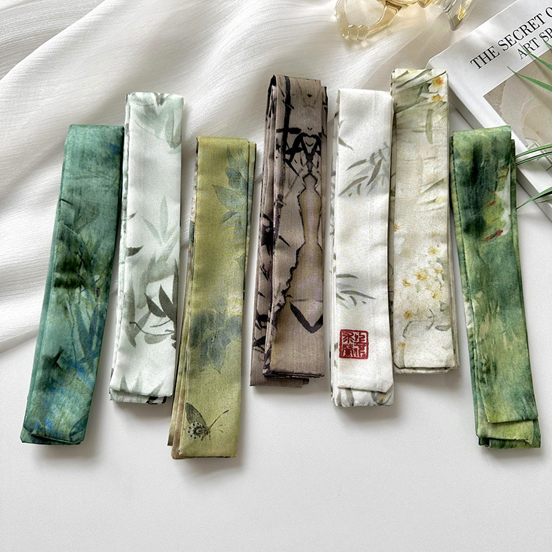 春の新作古風水墨の細くて狭いプリントのシルクタオルの新しい中国式のリボンのヘアバンドはシルクの飾りを包んでいます。