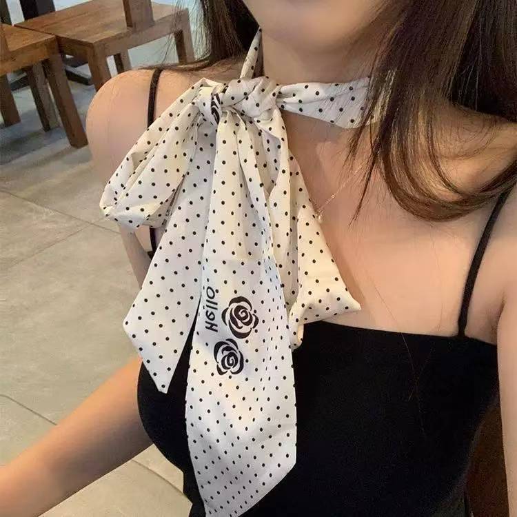 フランス風の波点レトロなシルクタオルの気質に合わせて、首のスカーフの長い長条の多機能のベルトを縛って小さいリボンを飾ります。