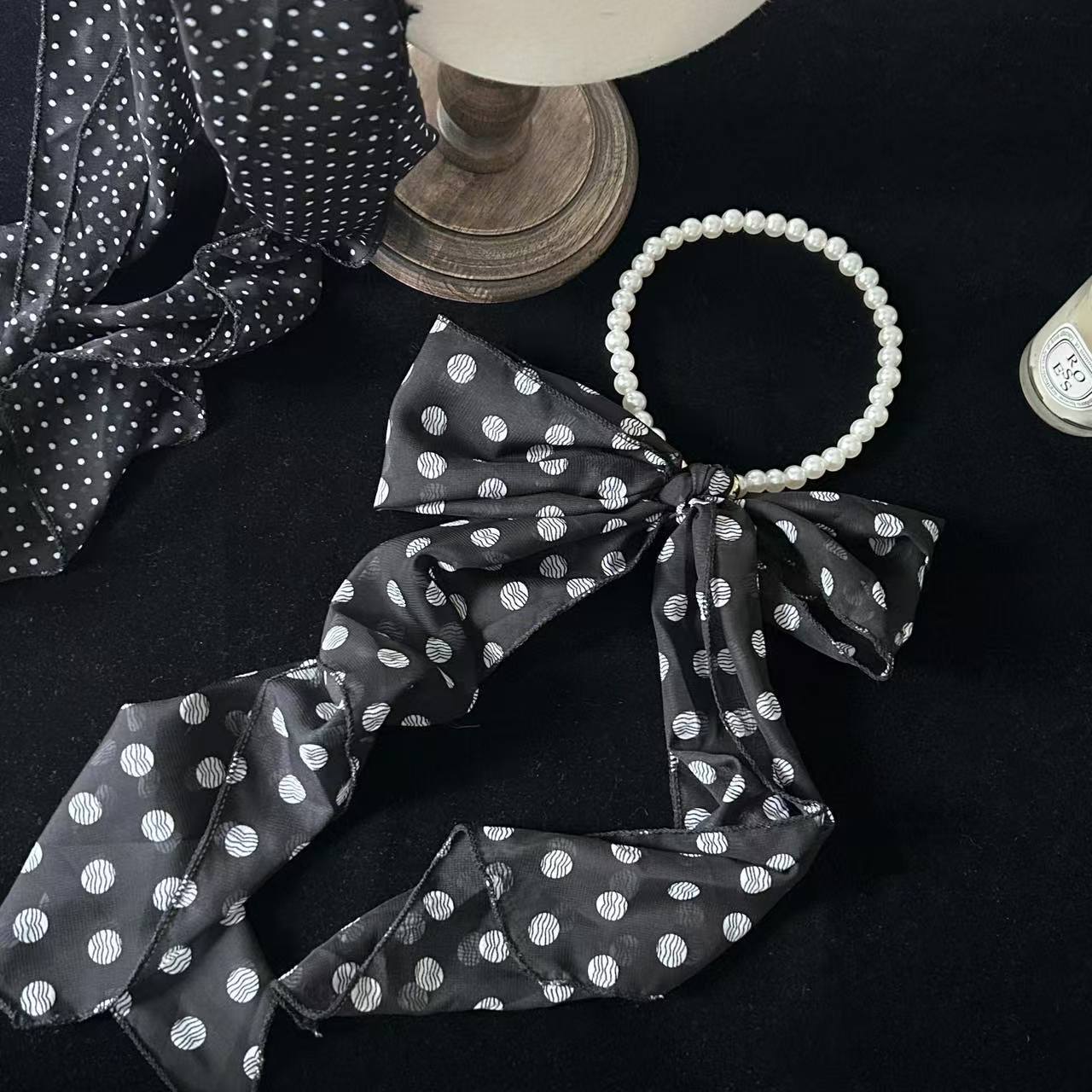 春夏新作レトロ真珠波点シルクタオル長条系首シフォンリボン