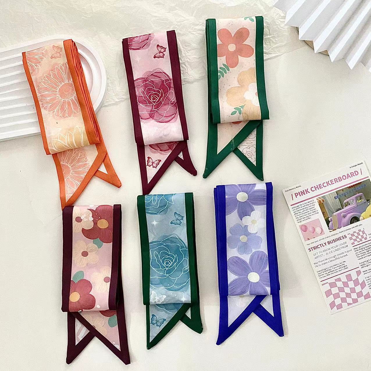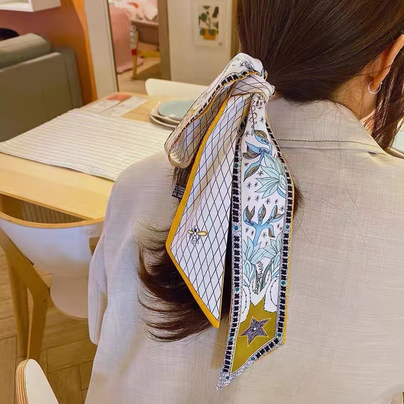 韓国系の砕花の長いスカーフ春夏の新型は首の薄いタイプのスカーフを結んでベルトを縛ってリボンを飾ります。