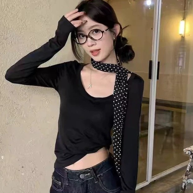 シンプルなコンビネーションシルクタオル春夏の新しい気質シャツは黒のポイントを飾って首のマフラーの多機能の小さいリボンを結びます。