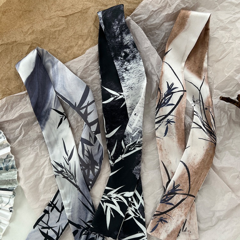 新中国風水墨画シルクタオル古風漢服結髪長条リボン百合気質国風装飾スカーフアクセサリー