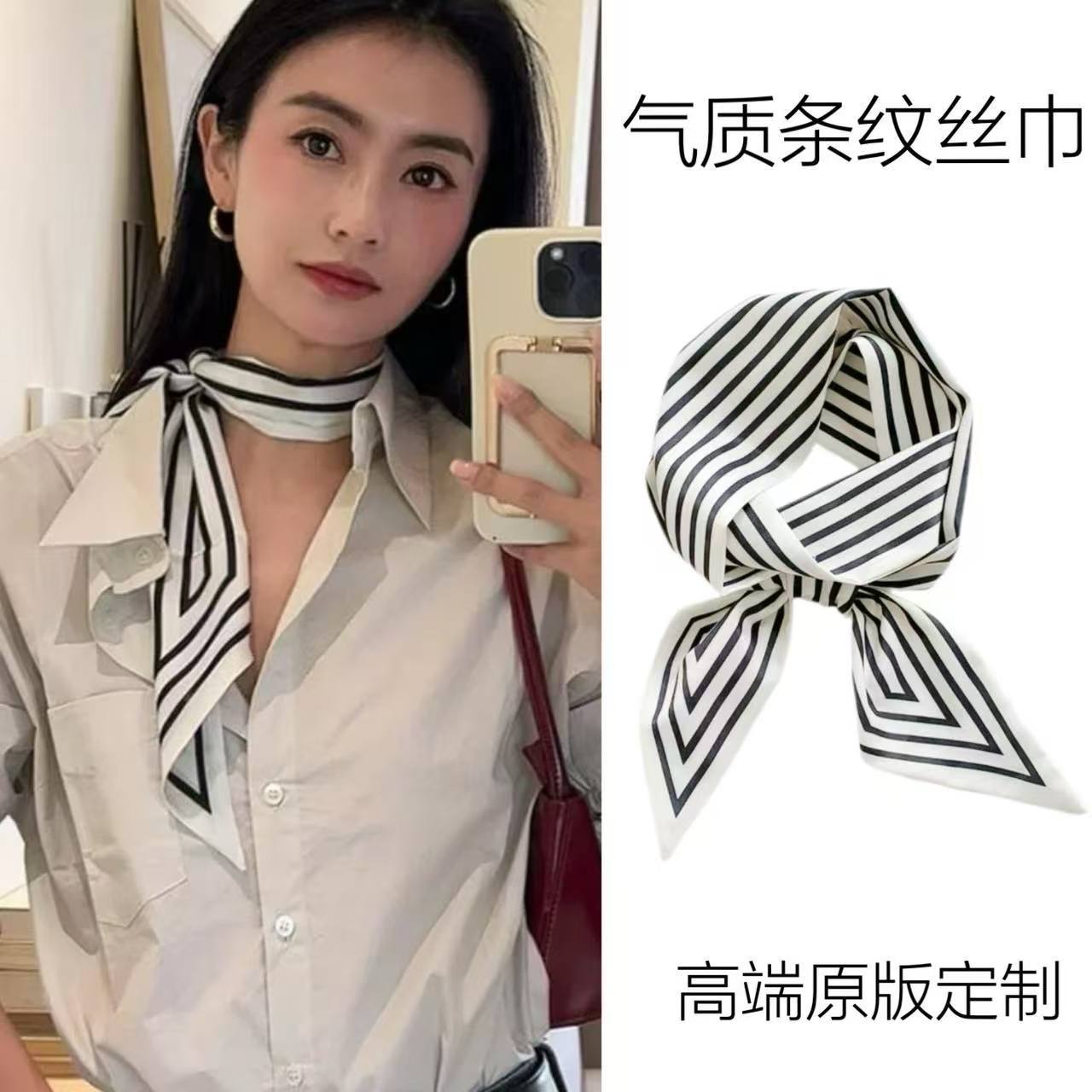 春夏の新型フランスのシンプルなストライプのシルクの女性は高級感を合わせてシャツのスカーフの気質の優しいマフラーを組み合わせます。
