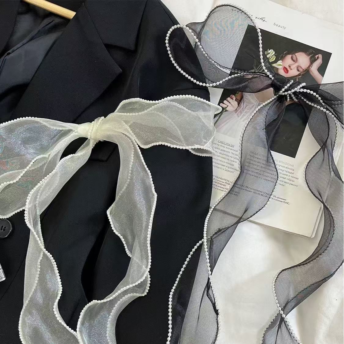 韓系の小衆の真珠の辺の網の糸のスカーフの超仙は髪を縛って長い条を包んでレトロな系の首を持って小さいリボンを飾ります。