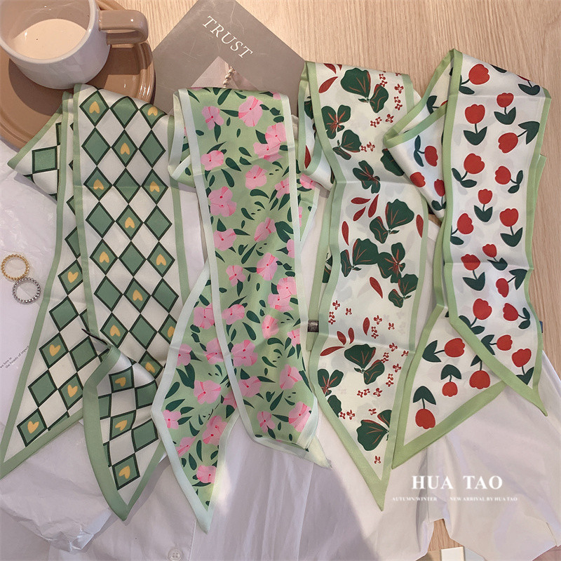 長清新緑系白多機能のシルクタオルの女性の新しい長さのリボンは髪を縛って飾ります。