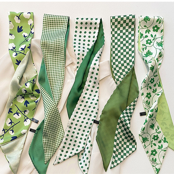 小清新な緑系のヘアバンドのシルクタオルの小さい長い女性の薄いサテンのマフラーのリボンのリボンのリボンの飾りのスカーフの百合