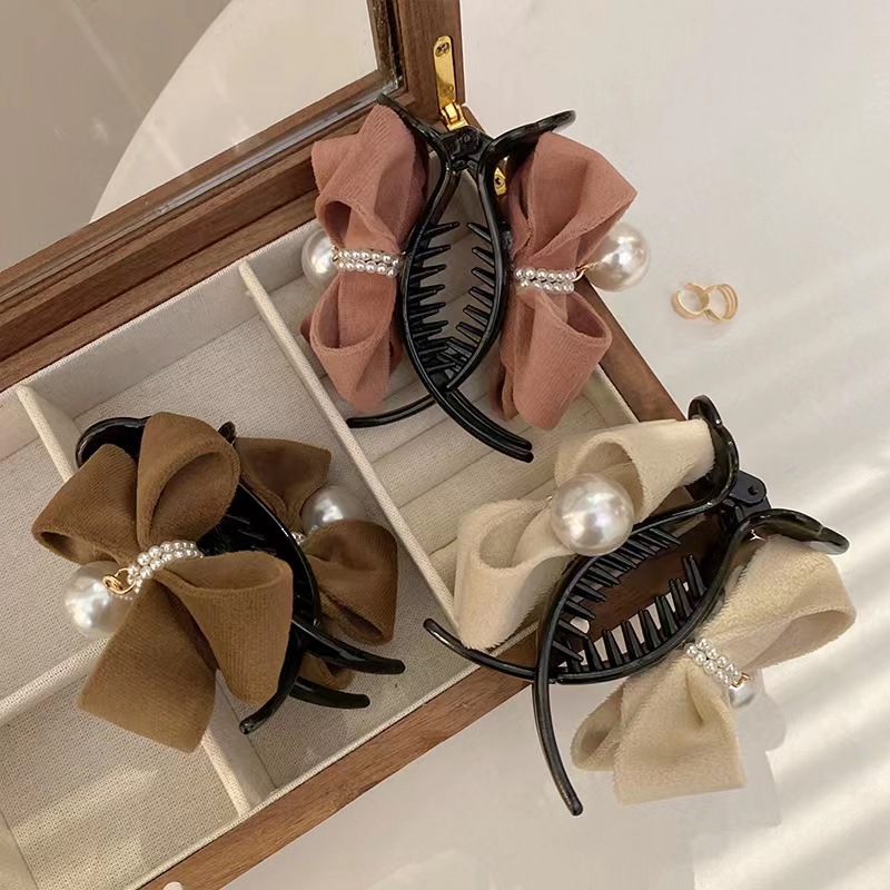 冬の植毛蝶結び真珠クリップ精致な丸子頭サメクリップ高級感後頭部ピンアクセサリー女