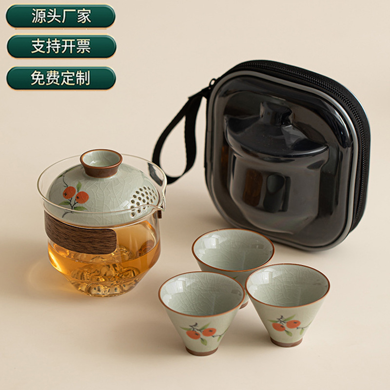 兄窯手描き快客杯一壺三杯ガラス手掴み壺屋外携帯旅行茶器プレゼントカスタムロゴ