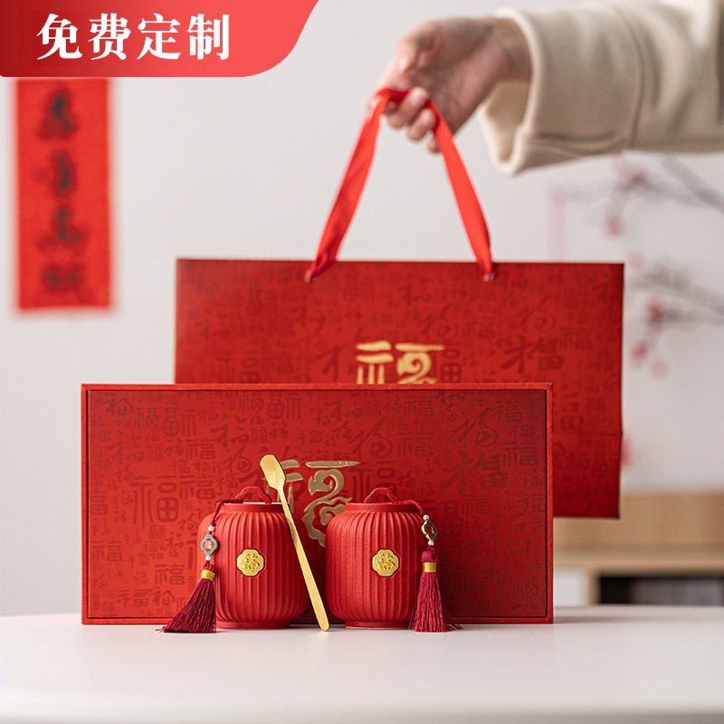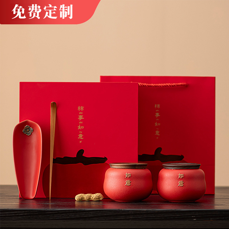 赤提灯茶葉缶喜糖缶トランペット万事如意陶磁器密封缶新年年会お土産オーダーメイド