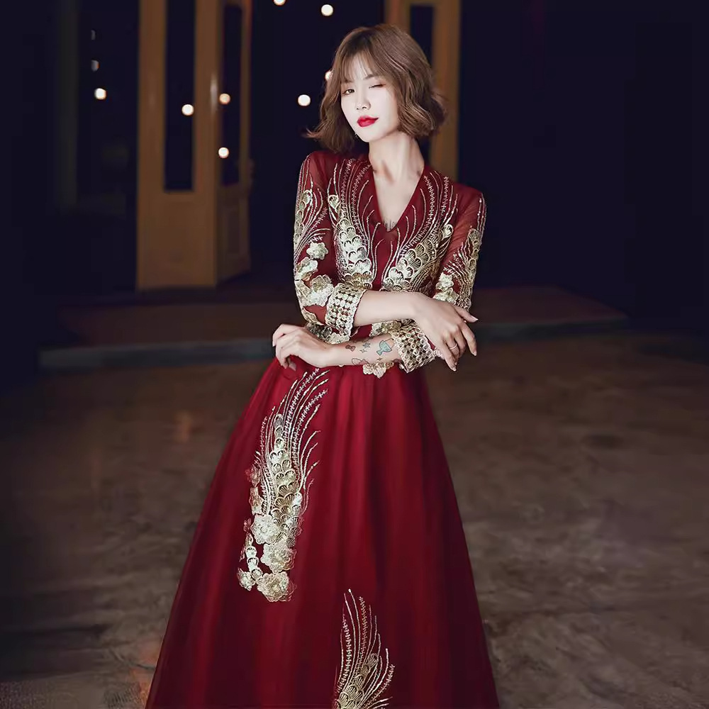 敬酒服花嫁2024新ワインレッド長袖vネック回門長型宴会ドレス女性気質が痩せている