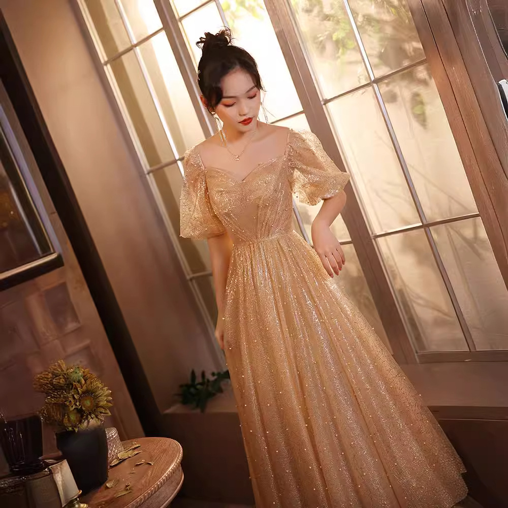 気質の宴会のドレスの女性の2024の新型の仙の気質の長い金はやせている花嫁の司会者のシャンパン色のドレスを現します。