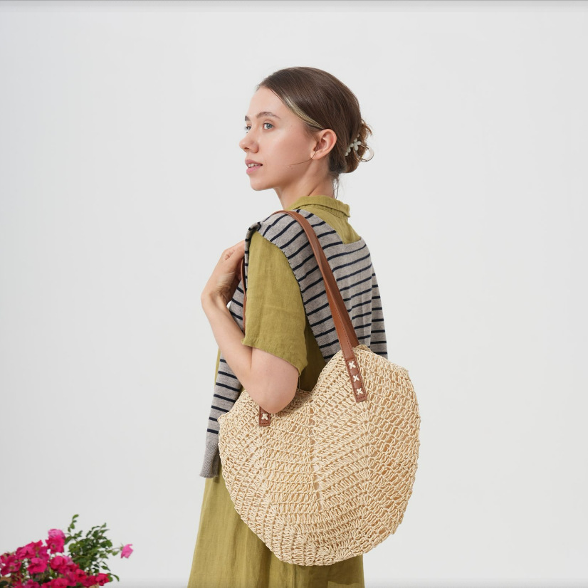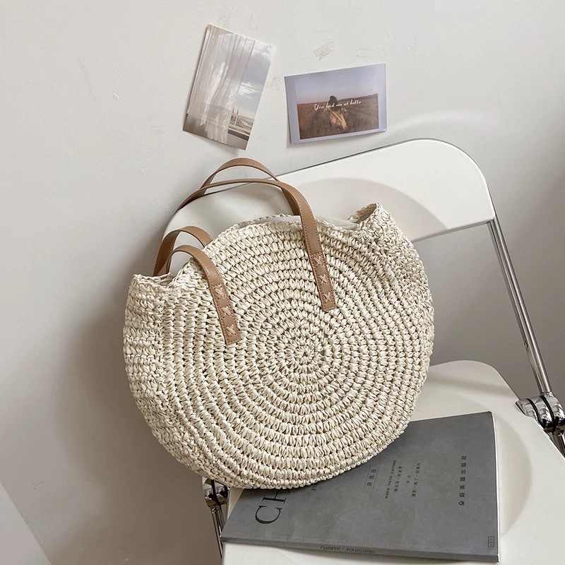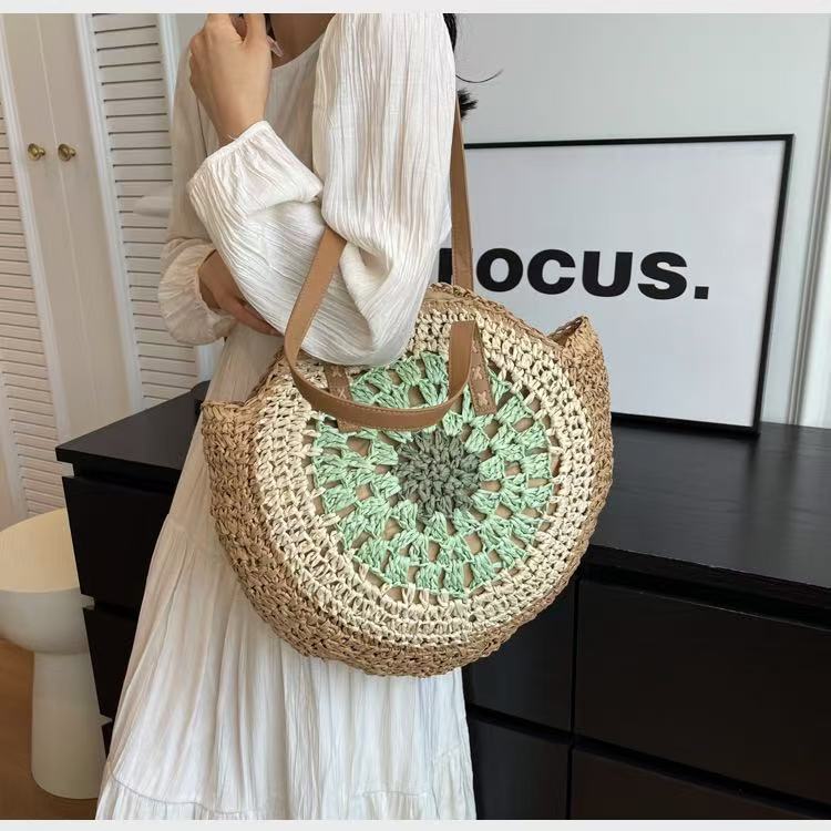 シングルショルダー丸型草編みバッグ、新作手編みバッグ、女性用大容量カジュアルバッグ、休暇用ビーチバッグ