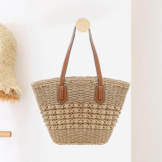 2025 新中空わらバッグ女性の織レディースバッグ大容量トートバッグショルダー海辺の休暇ビーチバッグ