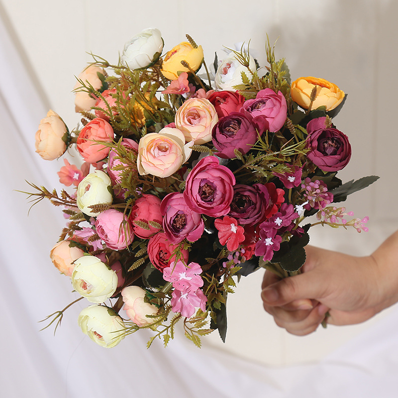 北欧の人造絹花茶玫茶蕾は家の装飾の結婚式のシミュレーションの花の客間のヨーロッパ式のバラの牡丹を縛ります。