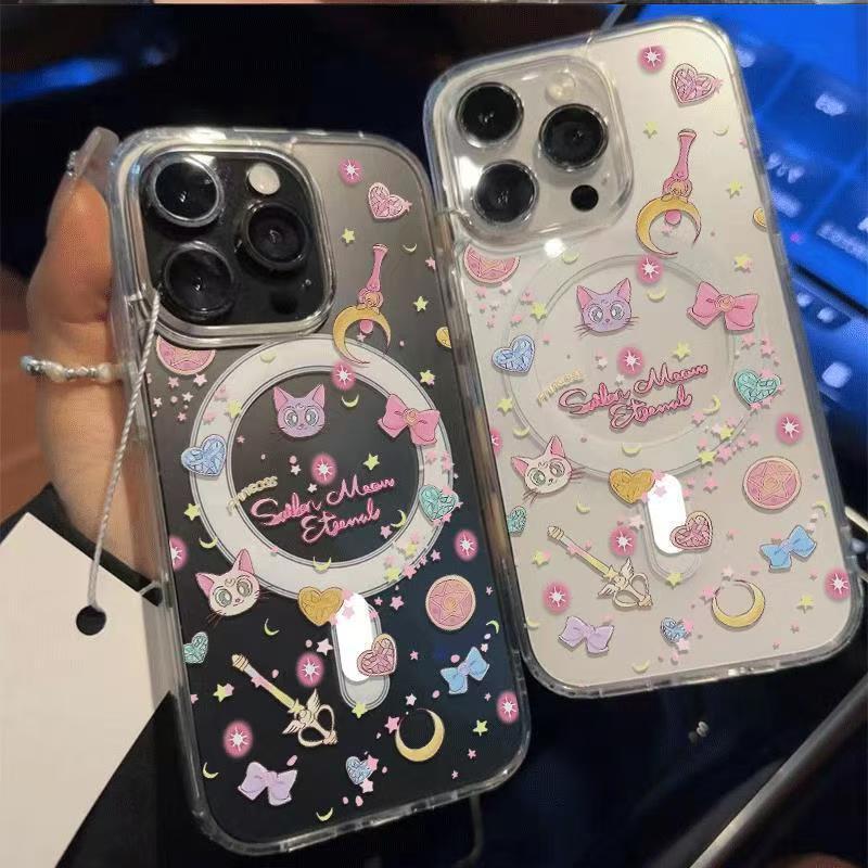 美少女ルナ猫適用アップル16マグネットアニメ透明携帯ケースiPhone14/13かわいい転倒防止