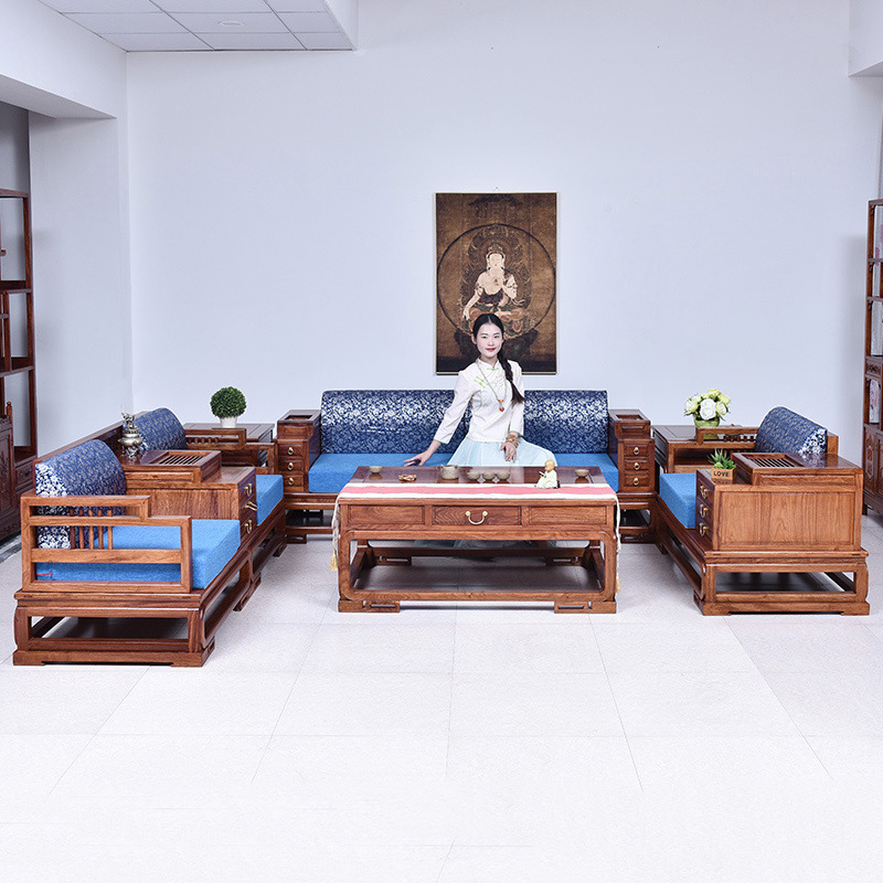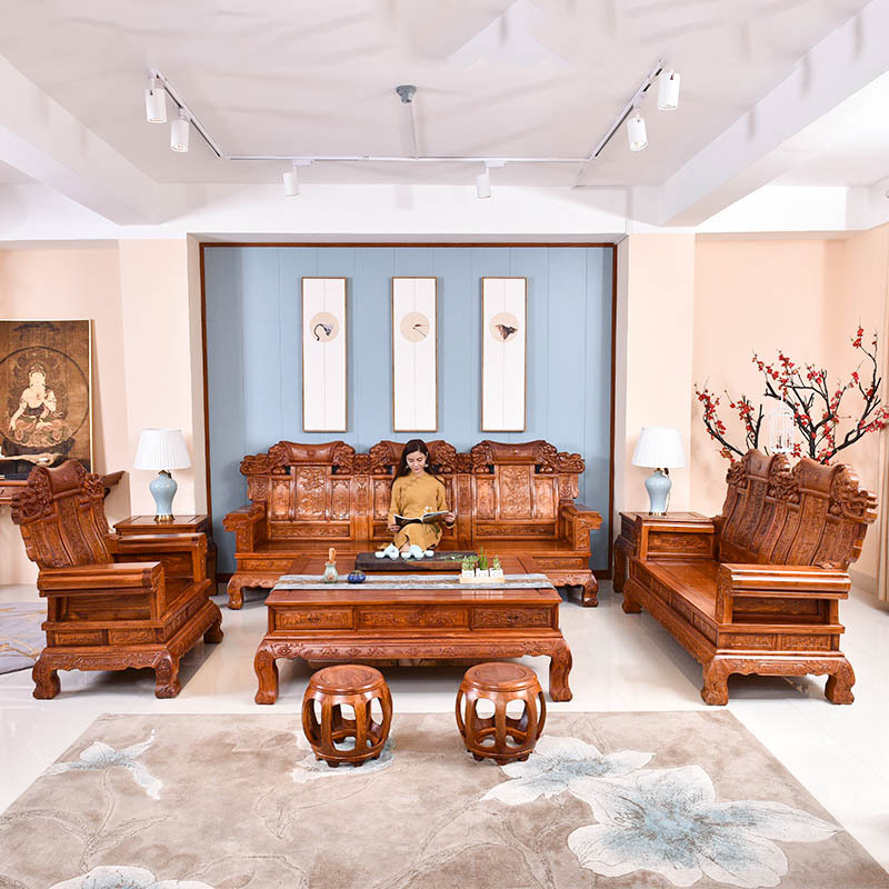芸銘の天下の赤い木の家具の花梨木の客間は大きいソファーの組み合わせを整えて中国式の3人の席を整えます。