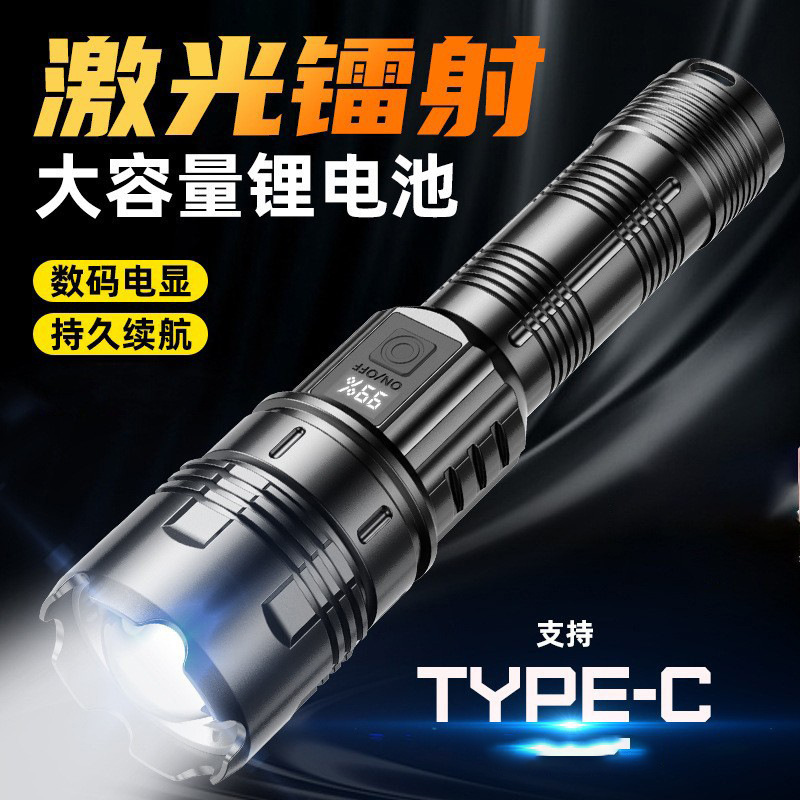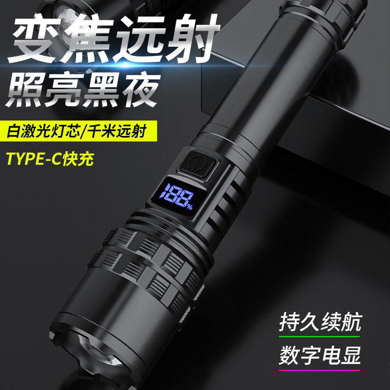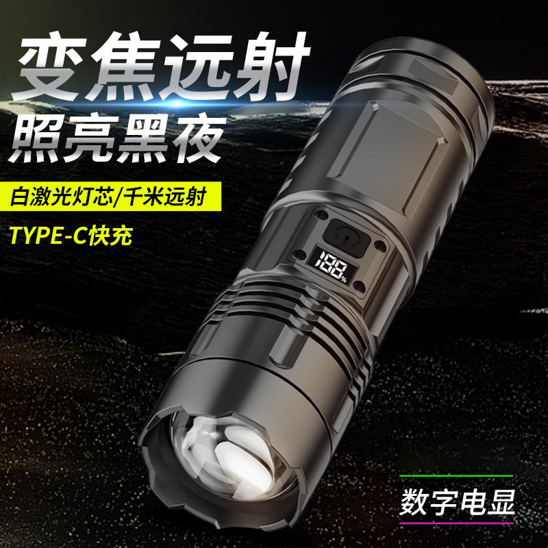 新型ハイライト白レーザー懐中電灯伸縮焦点調整デジタル表示type-c充電屋外緊急照明懐中電灯