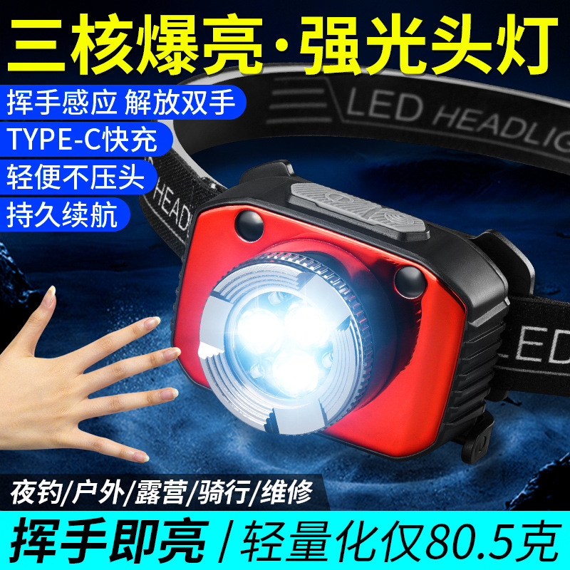 新型強光ヘッドライト軽便型アウトドア三光源手を振って感応照明ヘッドライトランニング夜釣りヘッドランプ