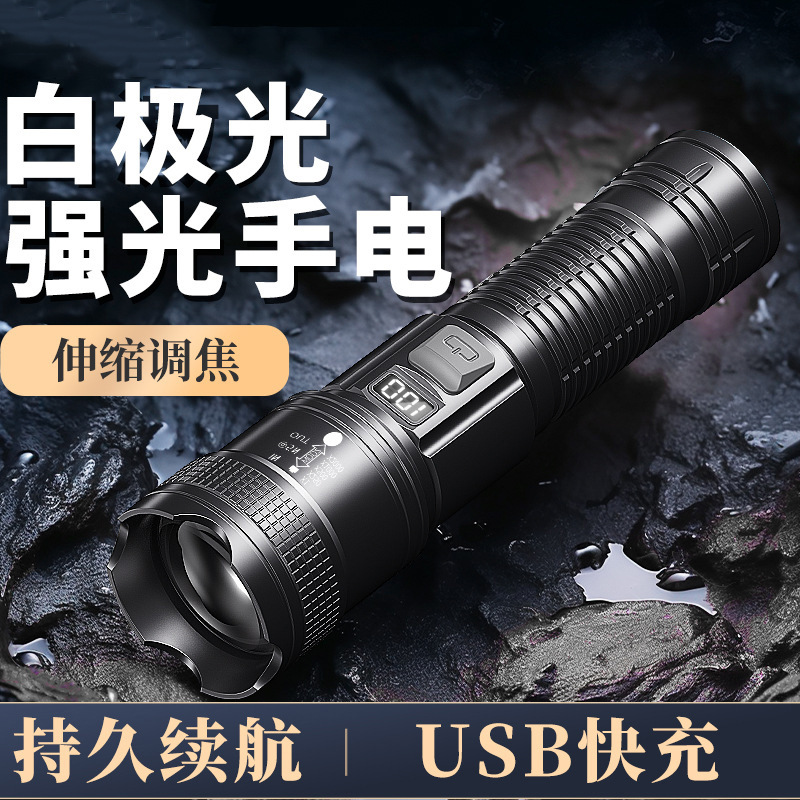 国境を越えた屋外パトロール集光遠射強光懐中電灯Type-c充電デジタル伸縮ズーム懐中電灯卸売り