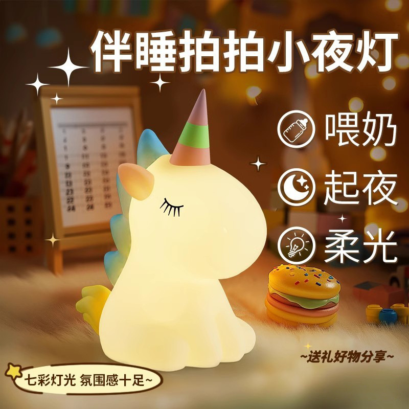 レインボーユニコーンシリコンパットライト寝室のベッドサイドの装飾品雰囲気ライト充電式とプラグインの両用ソフトライト目の保護テーブルランプ
