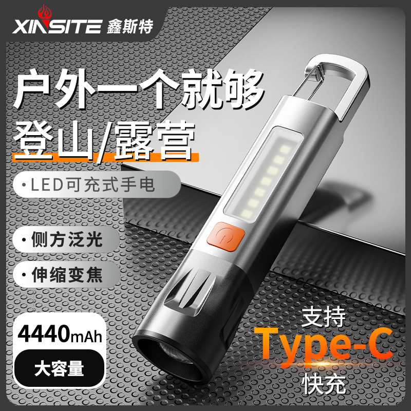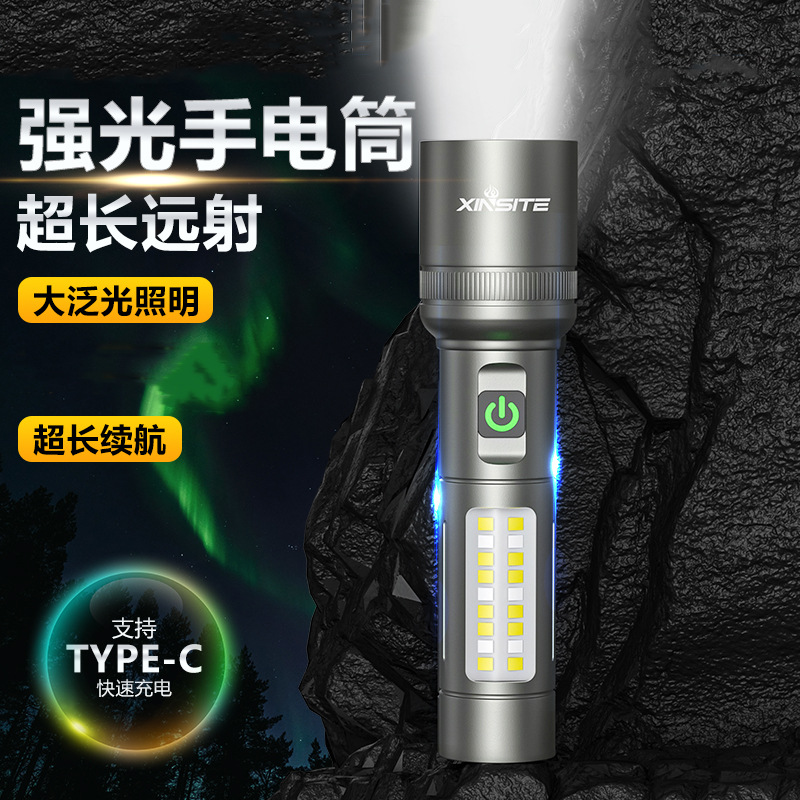ホワイトレーザー懐中電灯Type-C充電家庭用携帯強光ズーム懐中電灯屋外多機能作業サイドライト
