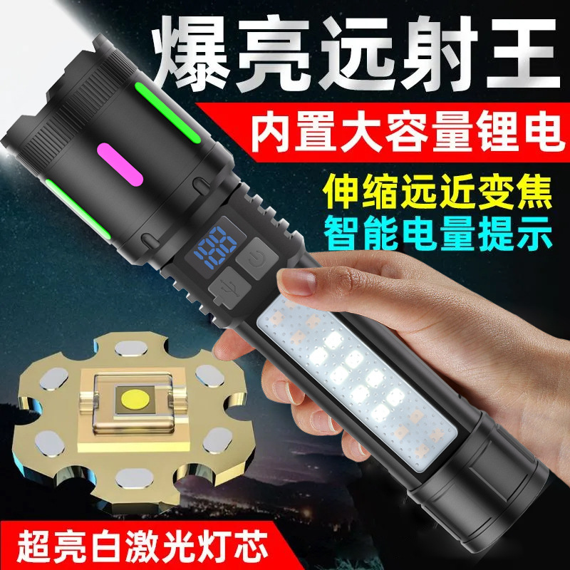 新型白レーザー超亮懐中電灯デジタル表示電力量ABS軽量伸縮ズーム赤青警報緊急サイドライト