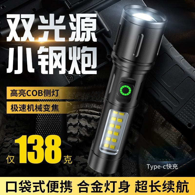 新型伸縮ズーム強光懐中電灯デジタル充電屋外照明帯出力cob赤青警告懐中電灯