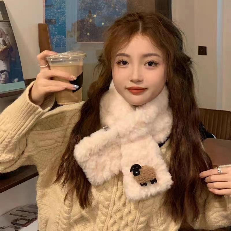 羊のマフラーの女子学生は冬に毛がふわふわしていて、首を囲んで保温しています。
