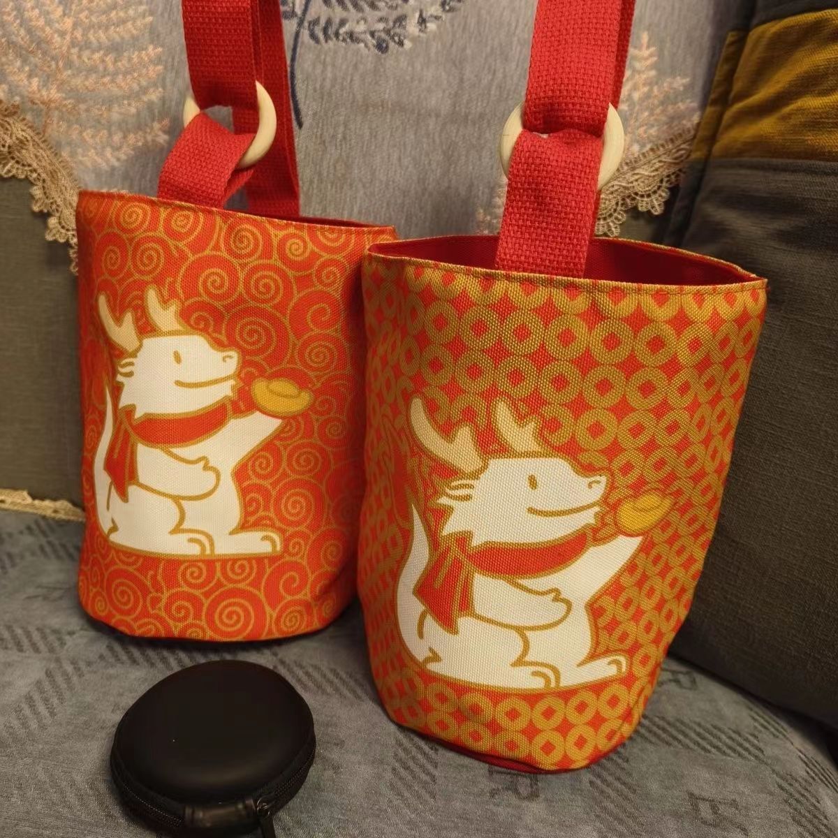 2024新型龍年おめでたい春節バケツキャンバスバッグ赤い手提げバッグ新年ギフトバッグ会社文創