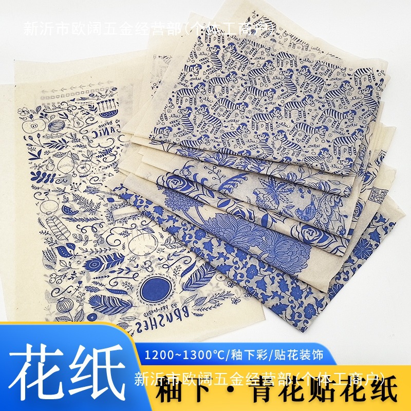陶器絵画、クリエイティブセラミック粘土、下絵色ステッカー、青と白の花紙ステッカー、印刷、転写、ローディング