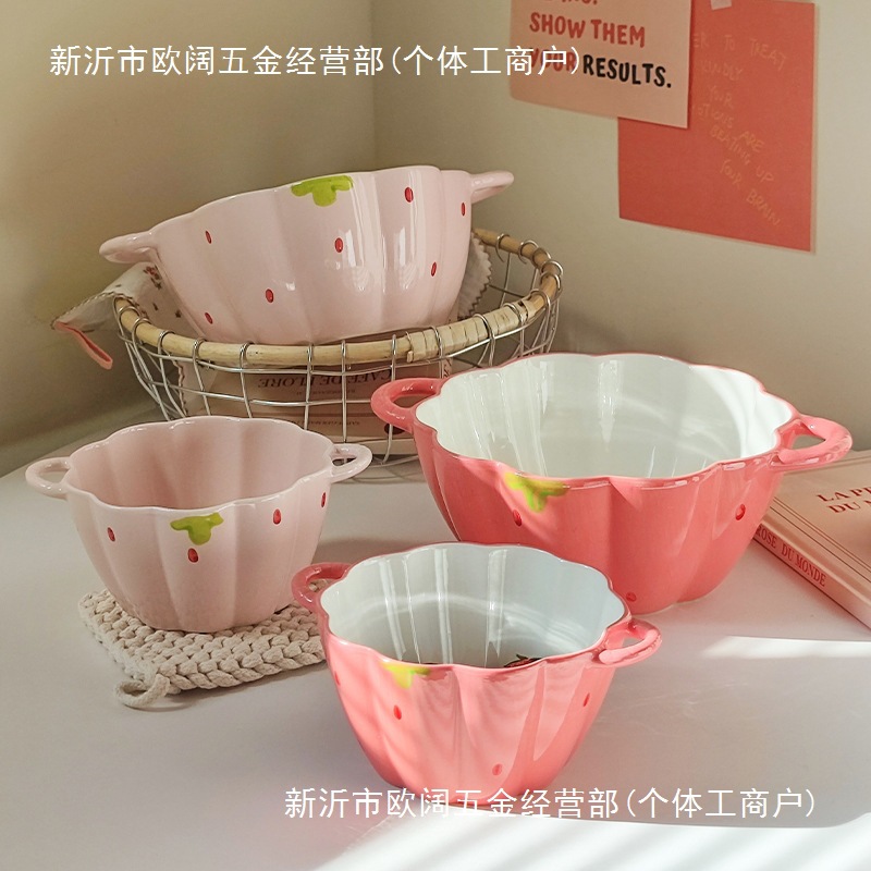 かわいいセラミックインスタントラーメンボウル双耳ボウル家庭用個人的な火傷防止イチゴの花びらボウルフルーツサラダスープヌードルボウル