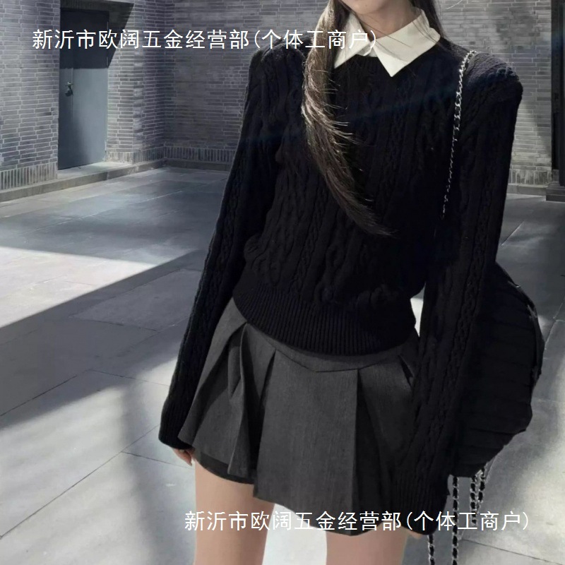 アメリカンレトロカレッジスタイルフェイクツーピースケーブルブラックセーターレディース秋冬右肩セータートップ