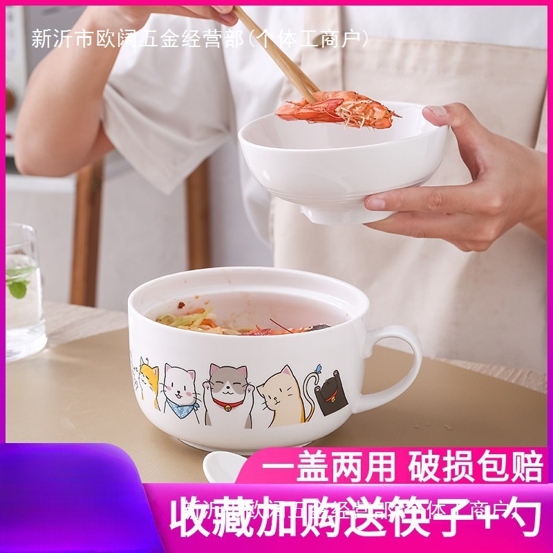 日本のクリエイティブ漫画セラミックインスタントラーメンボウル蓋付きボウル学生寮インスタントラーメンカップシングルライスボウル電子レンジ対応