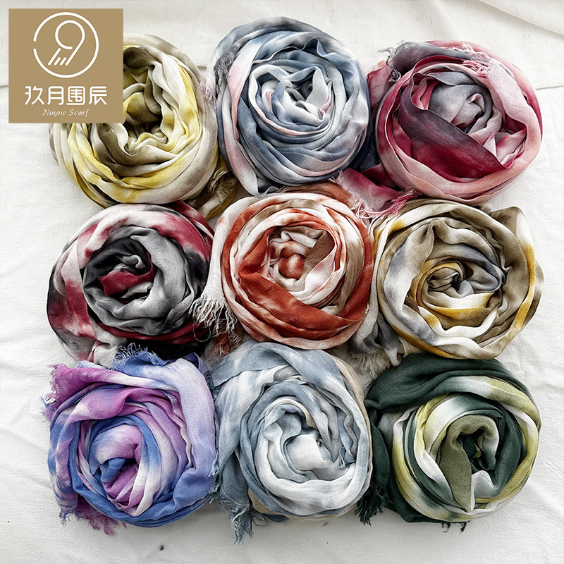 春のクロスボーダー風個性的な薄手のタイダイ柄スカーフ、女性向けインスタ映え、ニッチな旅行用日焼け止めショール、フリンジ付きシルクスカーフ