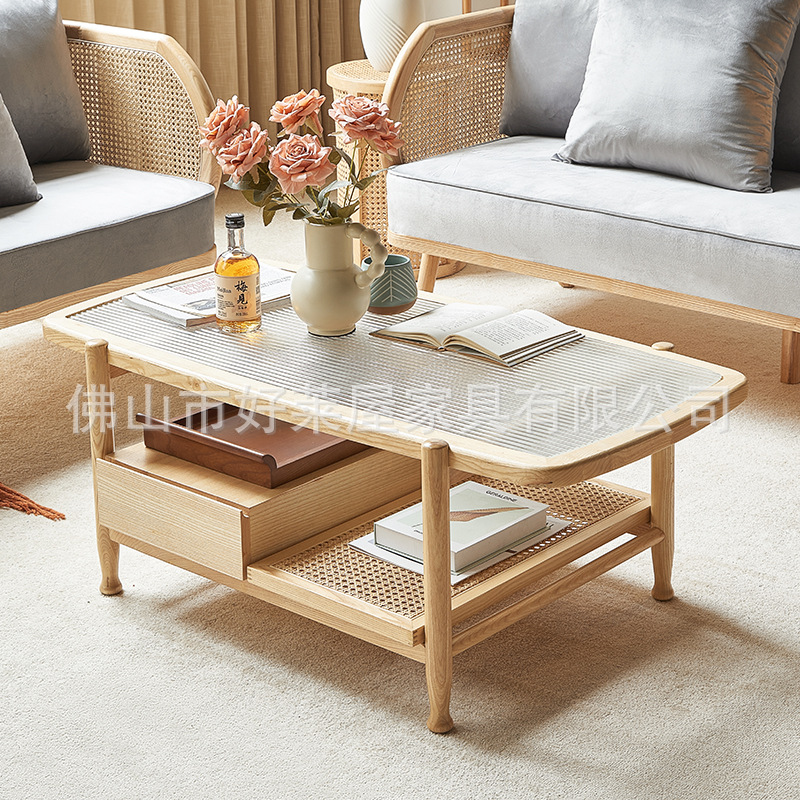 実木小戸型長虹ガラス日本式茶何客間家庭用長方形藤編民宿茶卓