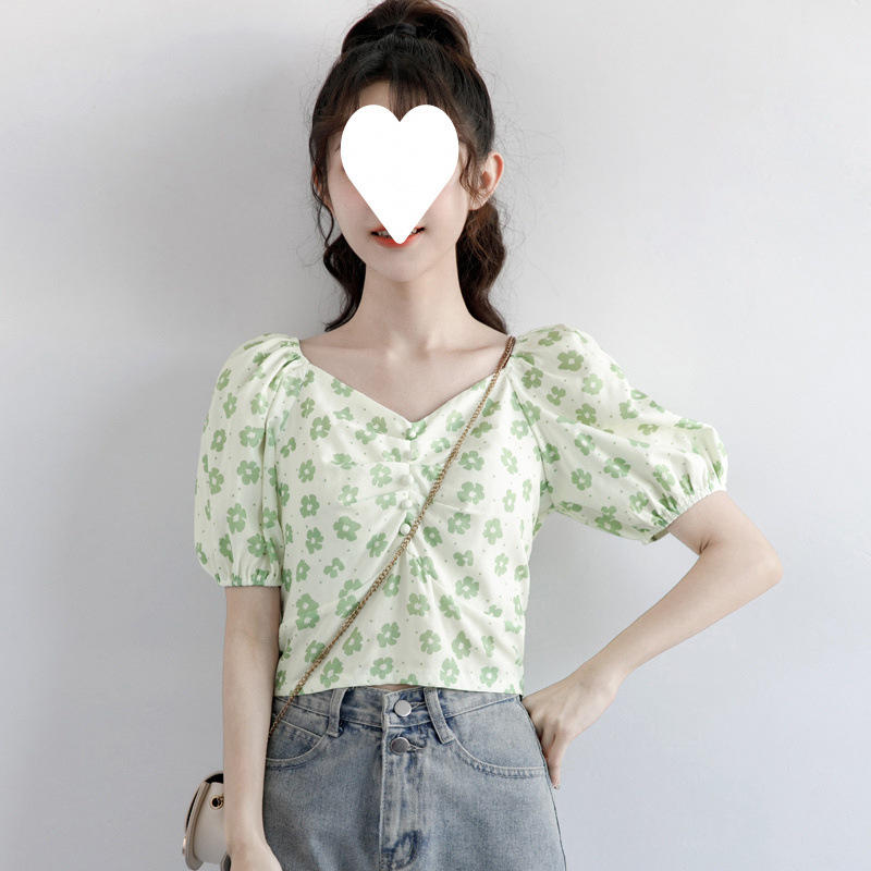 女性用サマーパフスリーブシャツ、甘いショート花柄トップス、爽やかな半袖シャツ、万能で着痩せ効果のあるトレンドのアウターウェア