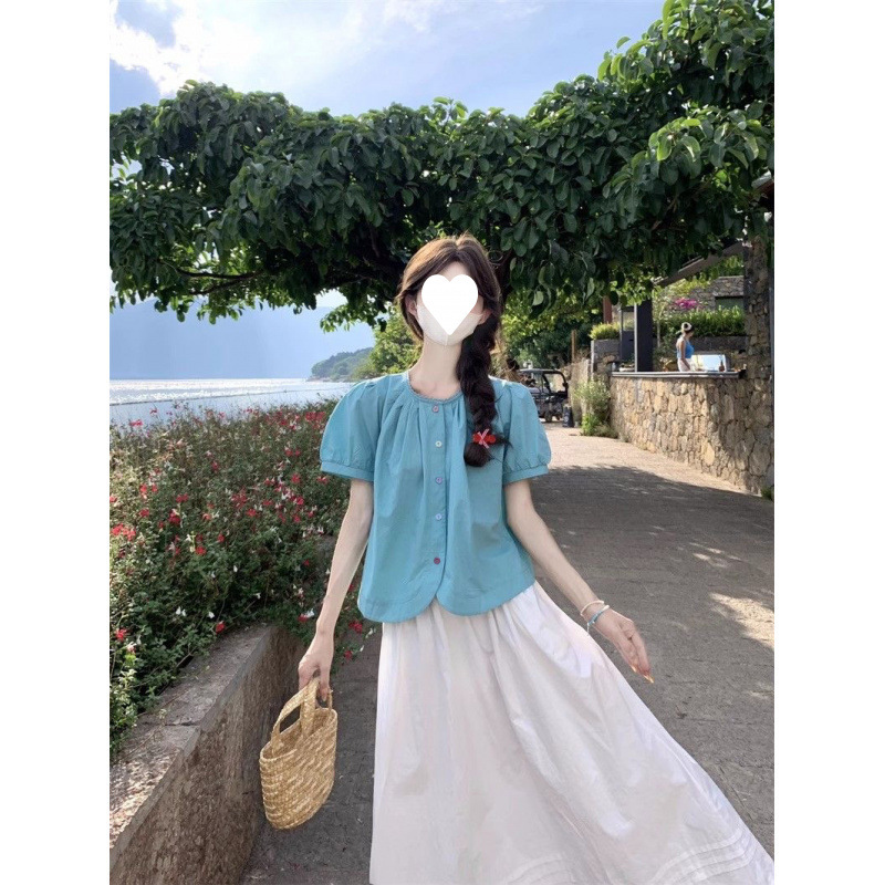 グリーンシックな甘いパフスリーブ半袖シャツ女性のための夏の 2025 新しいフレンチユニークな小さなトップショート