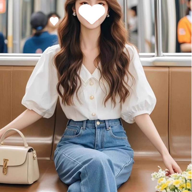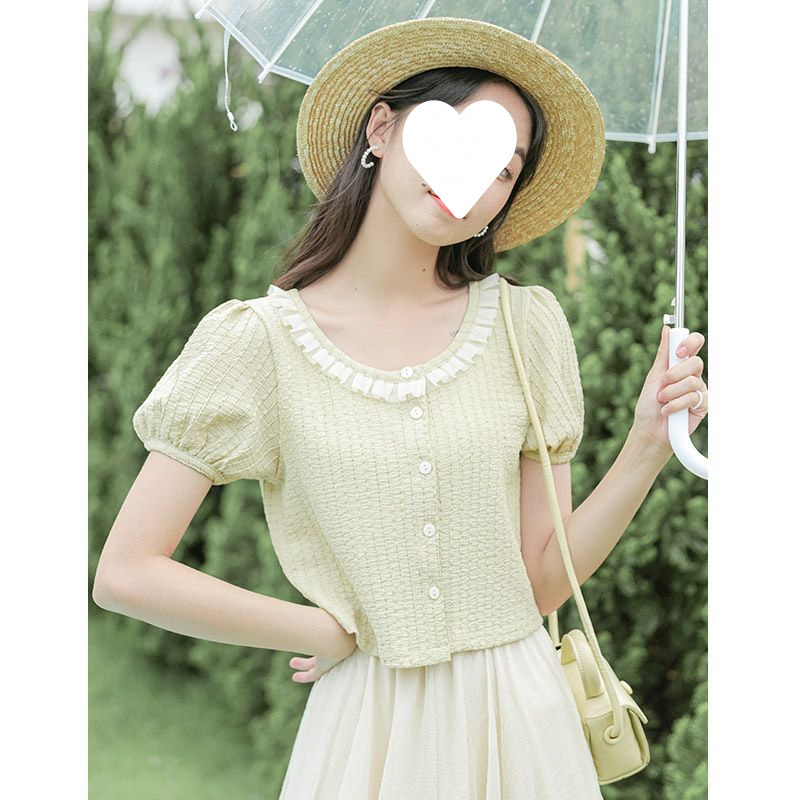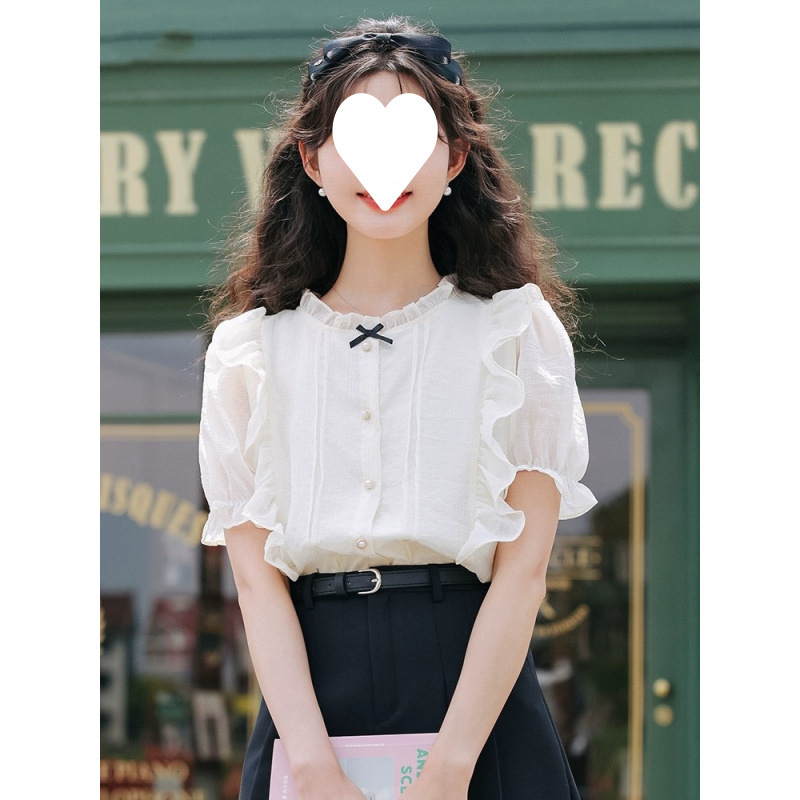 夏の新しいフレンチパフスリーブラウンドネックシャツ、女性用半袖耳デザインシャツ、トレンディで若々しく新鮮です