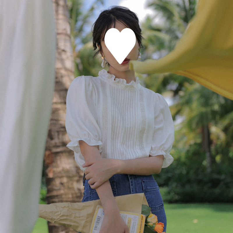 フレンチレトロホワイトフリルスタンドカラーシャツ女性の夏の新しいデザインパフスリーブ半袖シャツ女性の夏