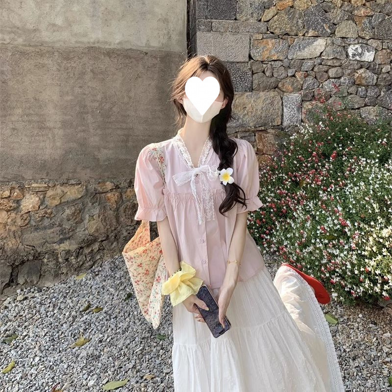 フレンチレースレースアップリボンVネック半袖シャツレディース夏ドーパミンピンクパフスリーブシャツトップ