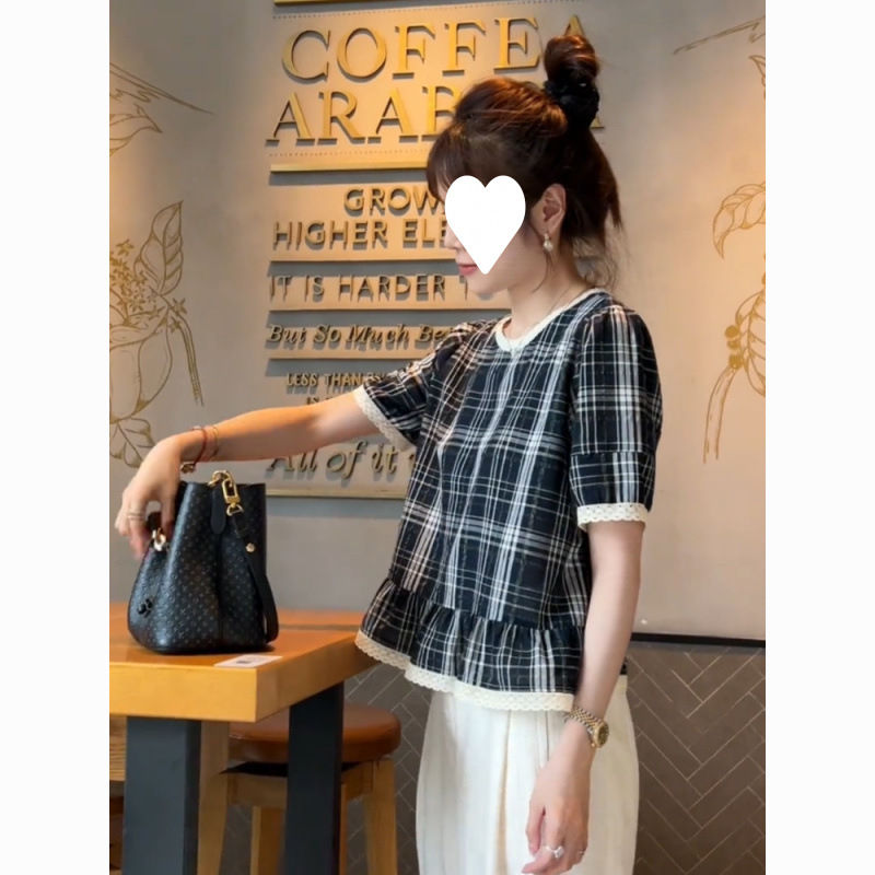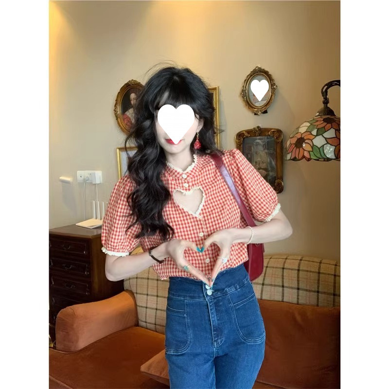 夏の新しい女性のデザインニッチレトロラブ中空シャツパフスリーブトップチェック柄半袖シャツ
