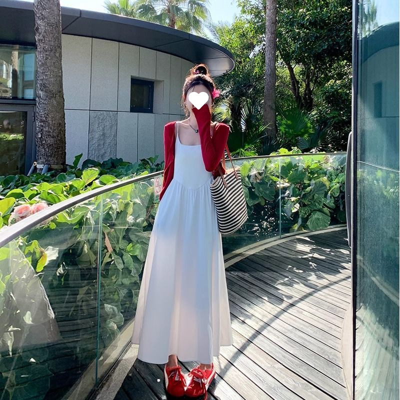 優しいフレンチホワイトサスペンダーノースリーブドレス女性の夏韓国スタイル痩身気質着用海辺休暇ロングスカート