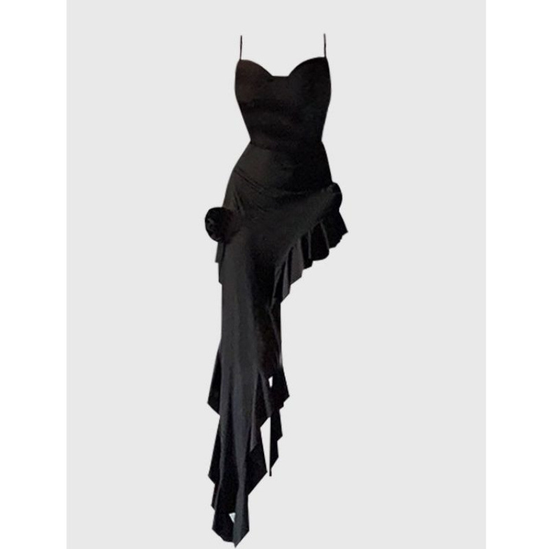 2025 フレンチピュアデューティーフリルブラックサスペンダードレス女性スリットスカート秋と冬のホットガール不規則なロングスカート