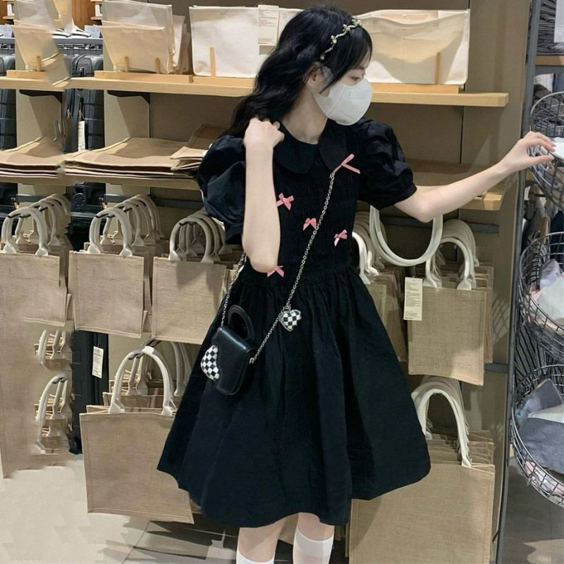 女子学生向けの小柄なカレッジスタイルの黒のパフスリーブドレス、ウエスト痩身、ベビードールカラースカート、気質