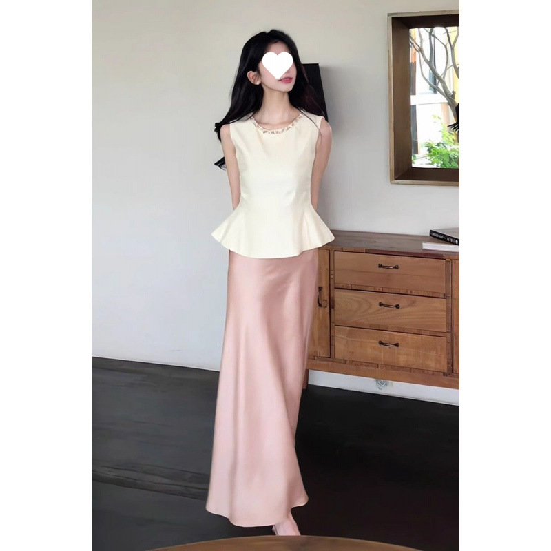 夏の新型フランス重工釘珠丸襟袖なしベスト上着女性ファッション魚尾半身スカート2点セット